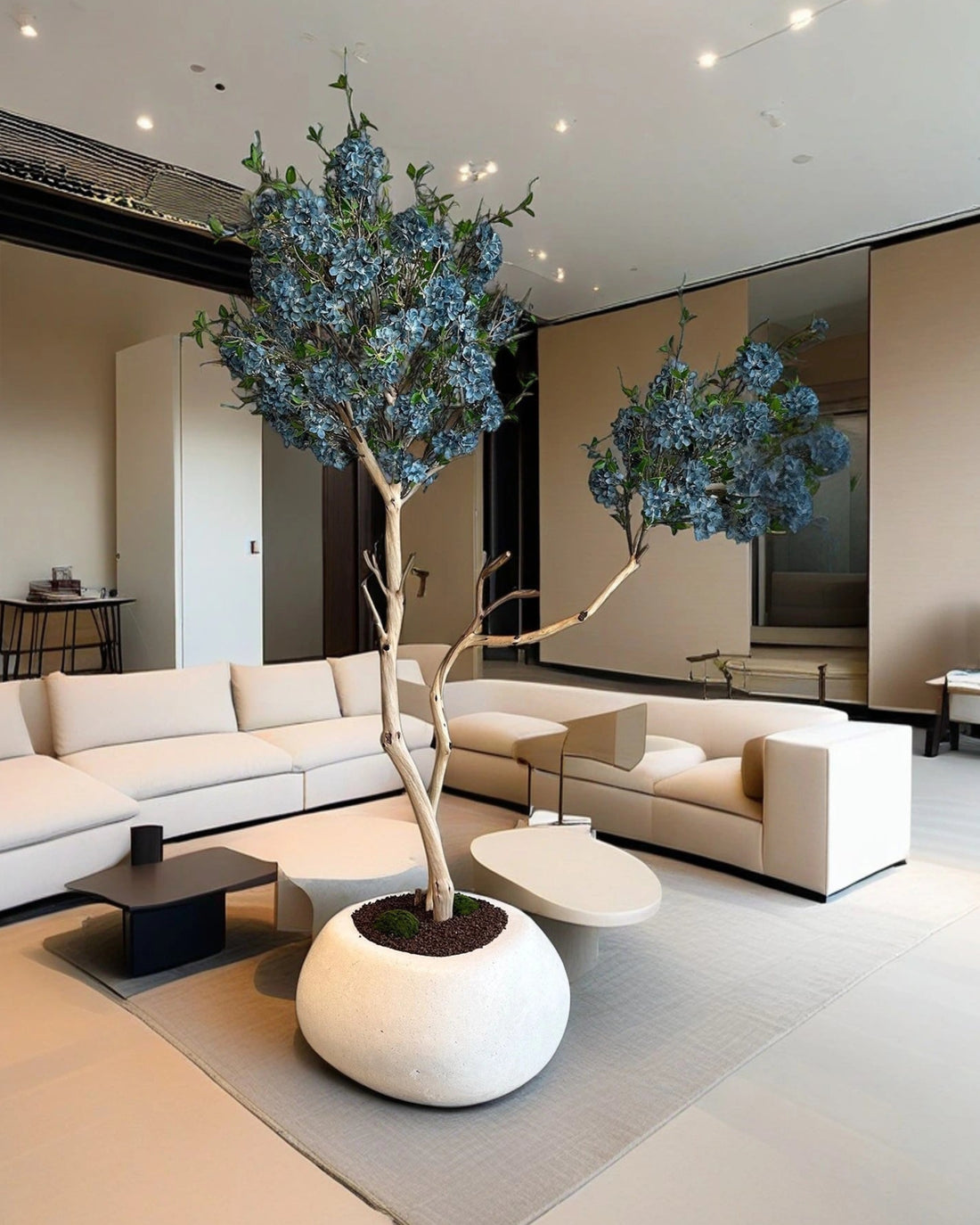 A stunning artificial tree with its natural white trunk and elegant grey-blue hydrangeas. It adds...